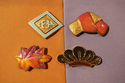 櫛松形釘隠 130,000円(税別)、紅葉形水滴 130,000円(税別)細見美術館所蔵の釘隠や襖の引手などをモチーフにした、森本錺金具製作所製の七宝帯留です。